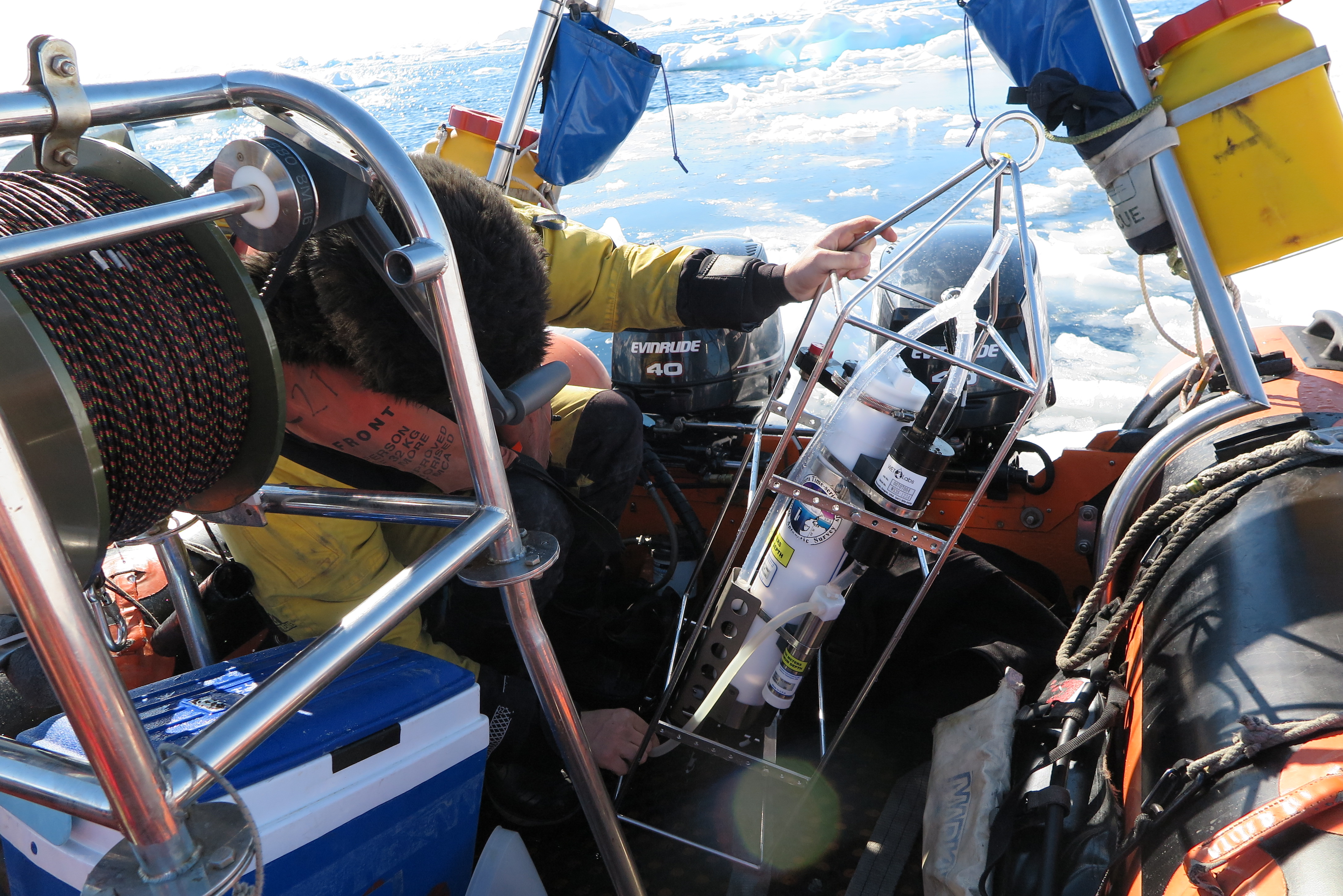 The CTD Instrument is lowered to as much as 500 metres then hand winched back onto the boat.